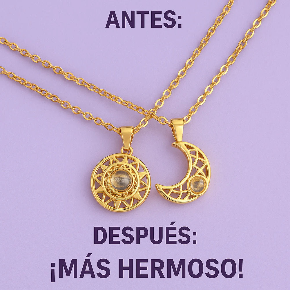 El Collar Sol & Luna Te Amo en 100 Idiomas no es un accesorio cualquiera, es un símbolo eterno de amor y conexión. Su diseño elegante, bañado en oro, lleva en su interior un cristal especial que al proyectarse con la cámara de tu celular revela un mensaje oculto: “Te amo” en 100 idiomas distintos.