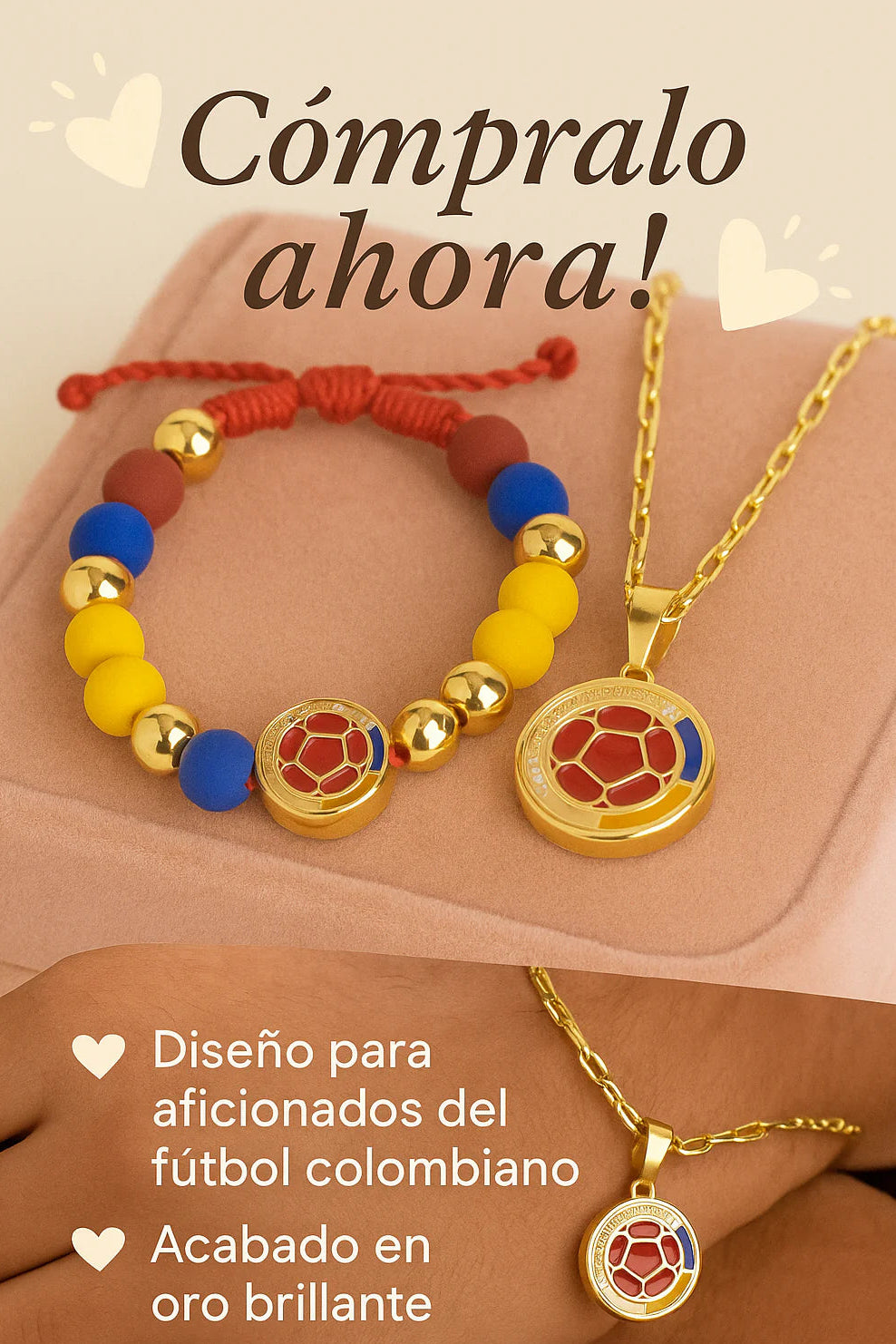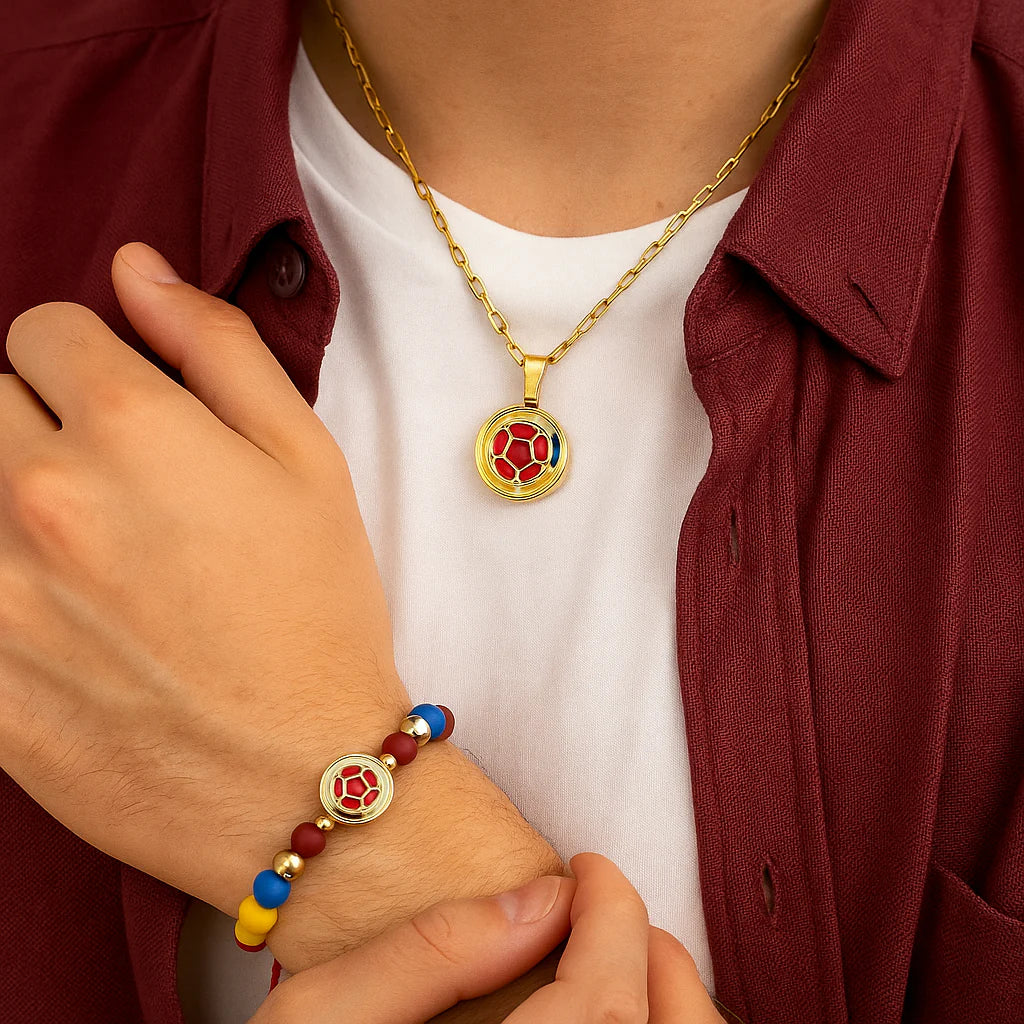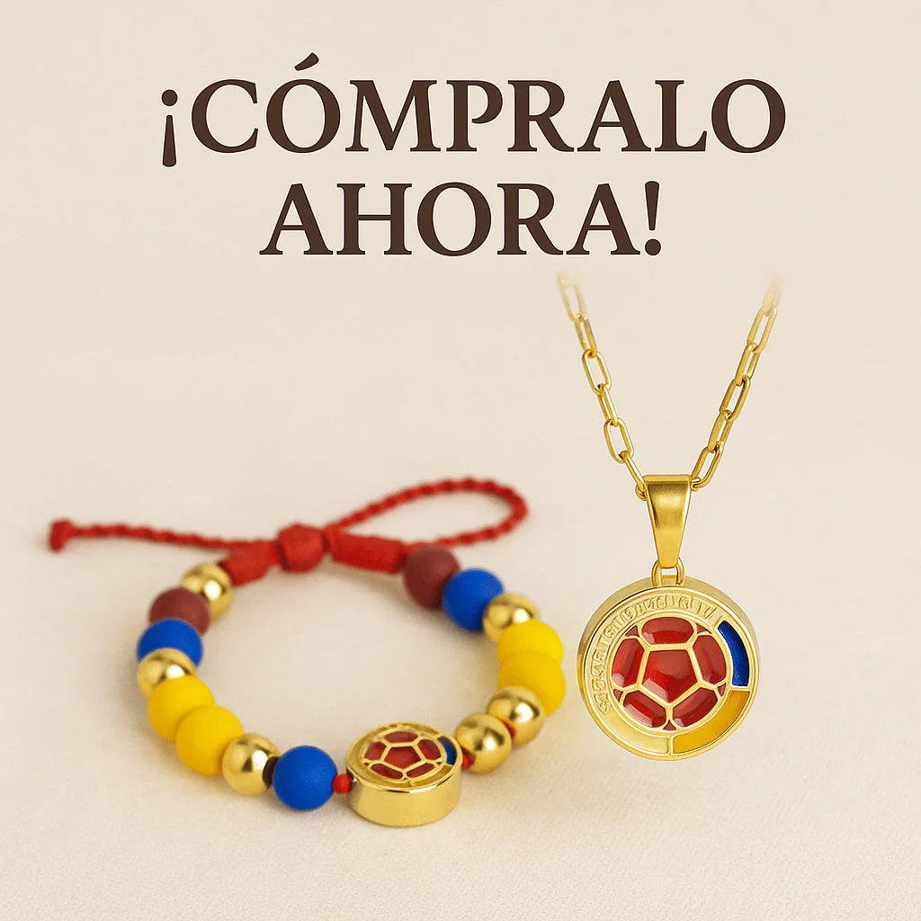 Este combo incluye una manilla artesanal hecha 100% a mano y un collar con dije premium esmaltado, ambos bañados en oro y diseñados para representar con elegancia la bandera tricolor. No importa si vas al estadio, a un parche con amigos o si simplemente quieres llevar a Colombia en el pecho… este kit te hará sentir parte del equipo.