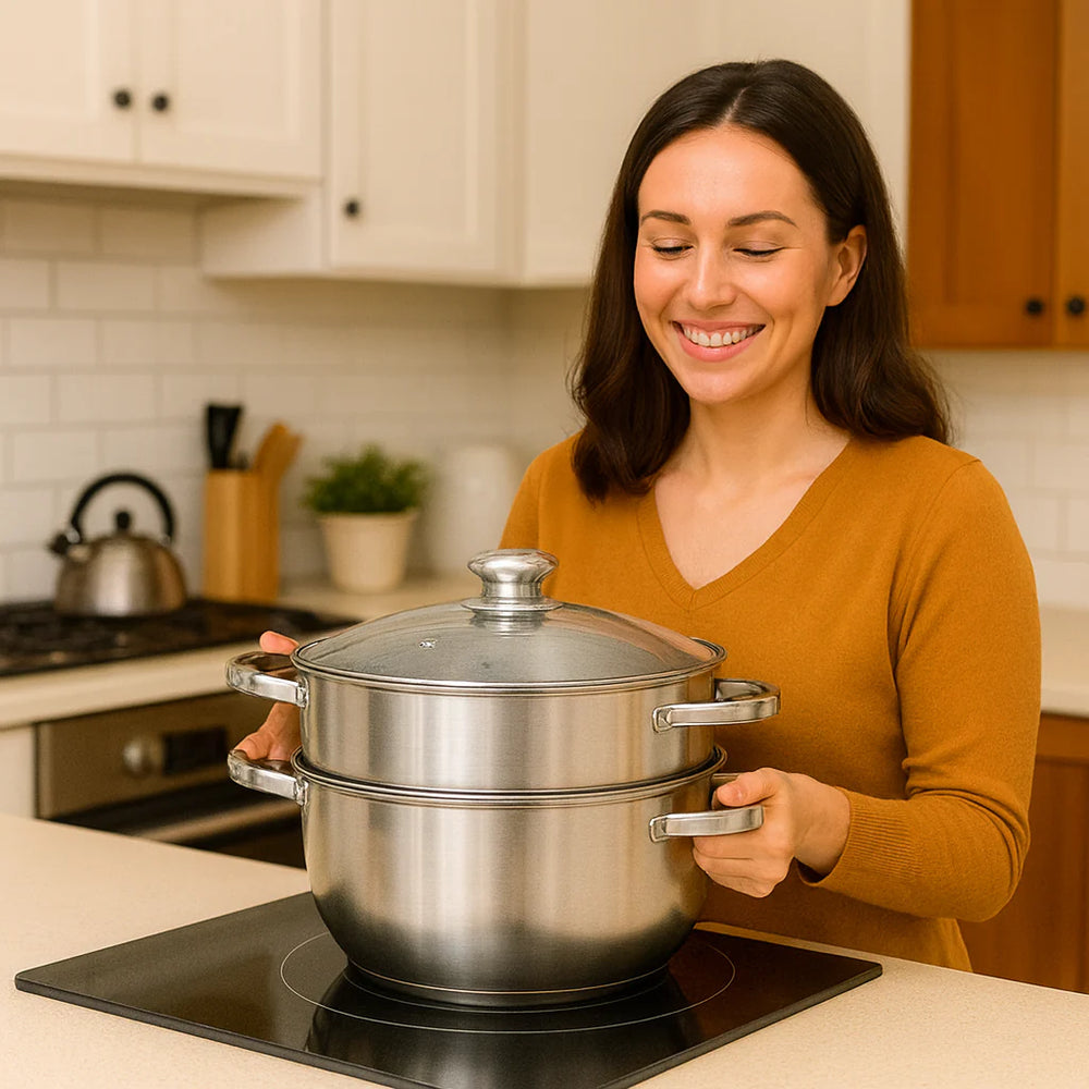 Su base sellada garantiza una distribución uniforme del calor, funcionando a la perfección en cocinas de inducción y gas. Resultado parejo en cada nivel, sin puntos fríos ni quemaduras.