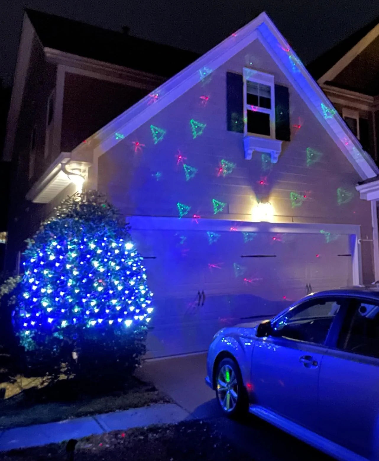 El Proyector LED Giratorio de Figuras Navideñas transforma cualquier pared, techo o fachada en un espectáculo lleno de color, movimiento y alegría.