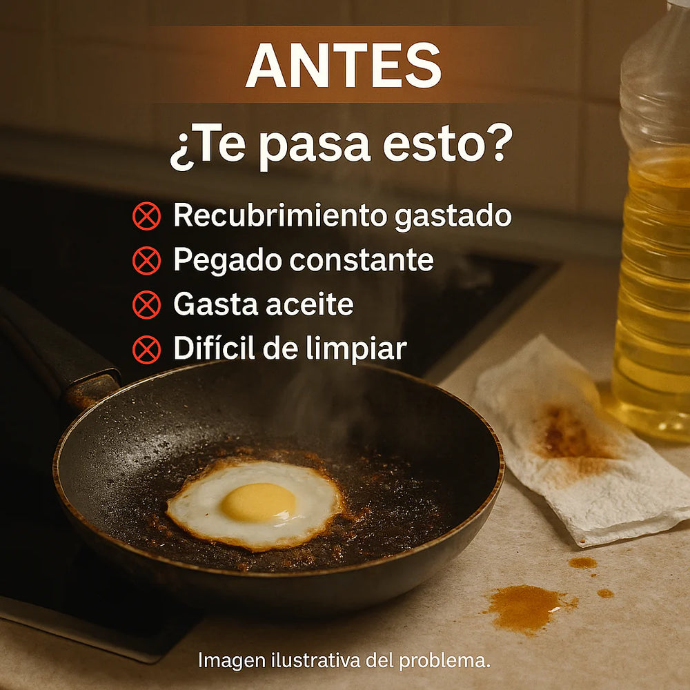 - Nada se pega (cocina sin estrés). El recubrimiento cerámico antiadherente hace que huevos, arepas y salteados se deslicen fácil, sin raspar ni romper la comida.