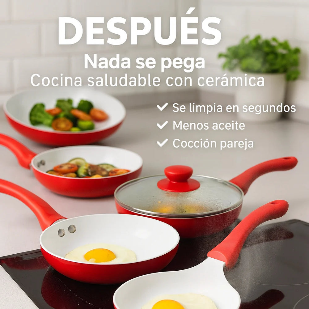3 sartenes (20/24/26 cm) + 2 tapas de vidrio. Revestimiento cerámico antiadherente: nada se pega y se limpia en segundos.